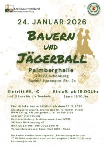 Am 24.01.2026 freuen wir uns auf unseren Bauern- und Jägerball in der Palmberghalle in Schönberg. Karte zum Preis von 65 Euro (inkl. 5 Lose mit wertvollen Preisen) gibt es beim Kreisbauernverband oder beim NWM-Verlag in Grevesmühlen.