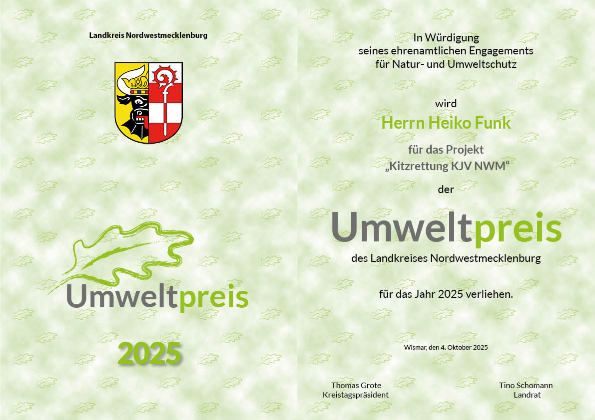 wir freuen uns riesig, dass das große Engagement der Kitzrettungsgruppe um Heiko Funk mit dem Umweltpreis des Landkreises Nordwestmecklenburg ausgezeichnet wurde. Auch wenn jedes vom Mähtod gerettete Kitz Lohn der Mühe ist, so ist diese große Ehrung auch eine öffentliche Anerkennung der Naturschutzarbeit der Jäger. Lieber Heiko, nochmals herzlichen Glückwunsch – und weiter so.